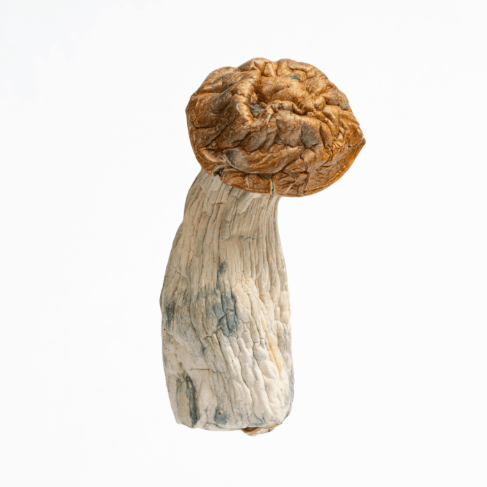 Makilla Gorilla is a rare and potent Psilocybe cubensis strain known for its heavy body structure, high psilocybin content, and intense psychedelic effects. A hybrid of unknown but powerful lineage, this strain has gained attention for its dense, thick stems and large caps that range in color from creamy white to golden tan, often showing deep blue bruising—a sign of its rich alkaloid content.